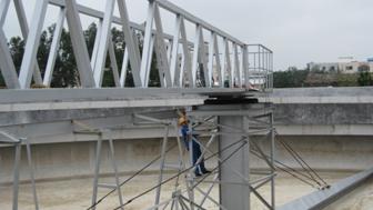 The centre drive single pipe by sucking machine work bridge, center drive system, the center pipe and supporting a, center seal cylinder, vertical planes, sucking pipe, slag draining slot and leave slag device, support truss and scrape NiBan, overflow weir plate and slag plate etc. The surrounding water into water surrounding the second pond, general also need to install retaining water board, water for center skirt around the second pond water, need to install the diversion tube.
